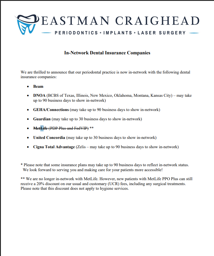 SARASOTA, Fla. - Michimich -- Eastman Craighead Periodontics, a leading provider of periodontal and implant care in Bradenton and Lakewood Ranch, has launched two initiatives to enhance patient access and convenience: expanded in-network insurance options and complimentary second opinions for treatment plans.