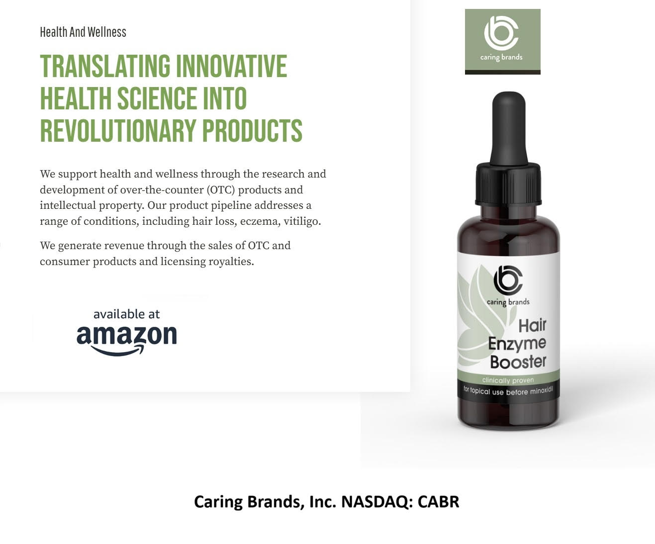 Caring Brands Inc. (N A S D A Q: CABR) has a growing portfolio of unique, patented, and clinically validated products for skin and hair growth. CABR intends to launch a total of 5 products over the next 2 years in addition to in-licensing additional products. CABR management has a successful track record of strategic acquisitions, rapid product development, IP development and product licensing. Revenues from the sales of Hair Enzyme Booster for the treatment of hair loss, and Photocil for the treatment of psoriasis and vitiligo, are currently being generated by direct sales in the US and licensees in India. Additional product opportunities include CB-101 for the treatment of eczema, NoStingz, a sunscreen that prevents jellyfish stings.