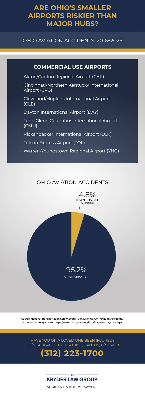 - The busiest commercial airports in Ohio were involved in just 4.8% of all accidents over the last decade.