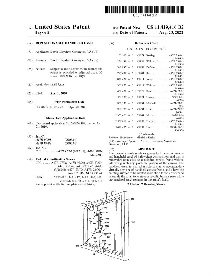 Traditional easels can be large, stationary, and difficult to transport. This innovative handheld system mounts directly to the back of a canvas frame, creating a secure handle and adjustable support structure that allows artists to reposition the canvas quickly while maintaining stability.