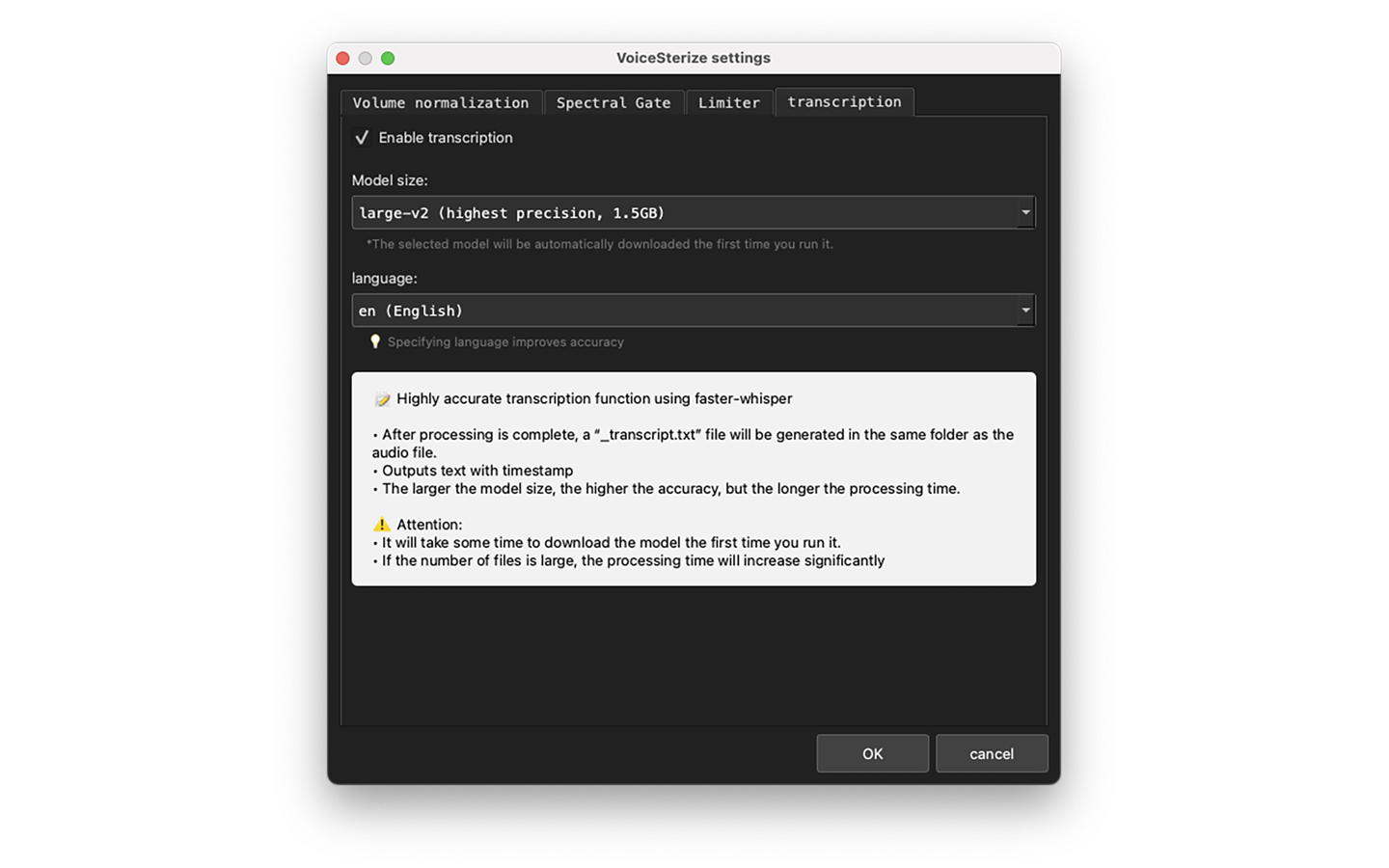 - Algorithmic Precision, Not AI Generation: Unlike recent "Generative AI" tools that synthesize artificial voices, VoiceSterize relies on SpectralNoiseGate, a pure Digital Signal Processing (DSP) algorithm, for noise reduction. It does not use AI to alter the audio signal. AI is utilized exclusively for the text transcription feature. This approach preserves the speaker's original emotion, intonation, and authenticity without generating fake audio data.