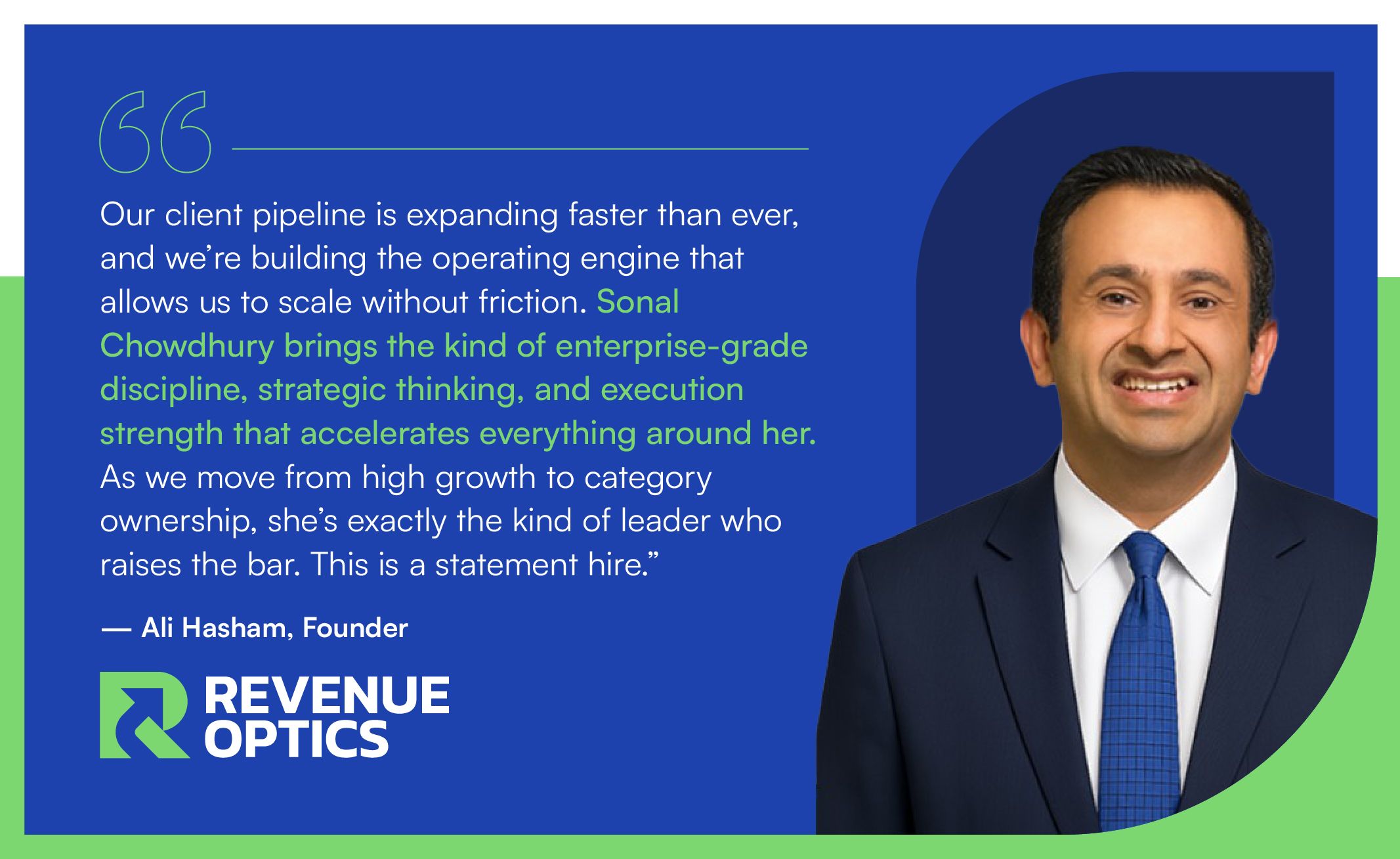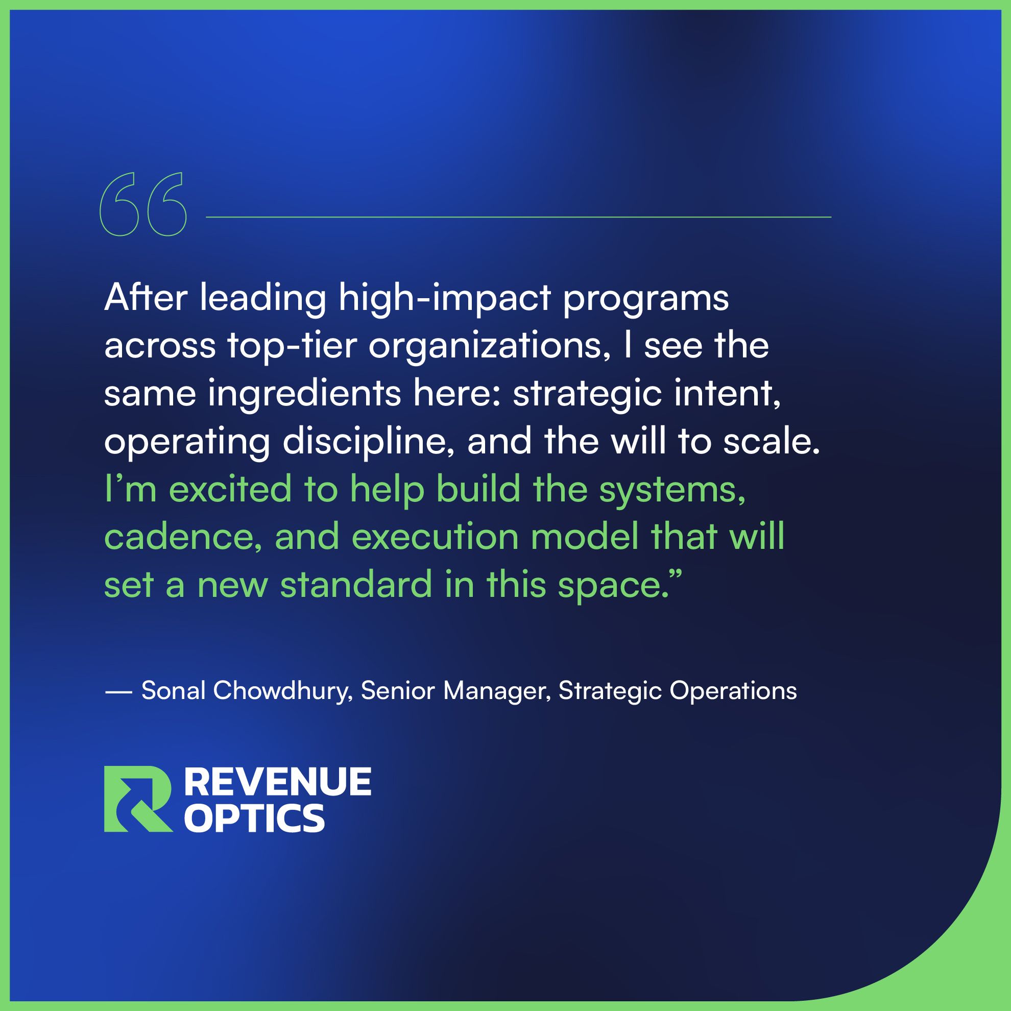 MEMPHIS, Tenn. - Michimich -- Revenue Optics, the fastest-emerging consultancy redefining inside-sales transformation for the North American B2B distribution sector, today announced the appointment of Sonal Chowdhury as Senior Manager – Strategic Operations. This hire marks a step-change in the firm's operating maturity and reinforces its accelerated path toward category leadership.