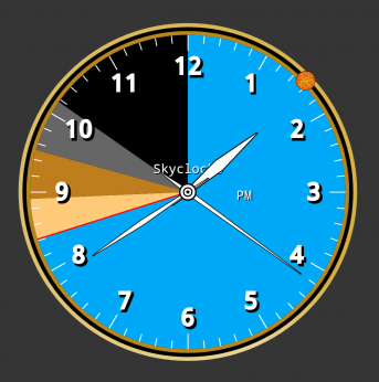 Skyclock delivers a pictograph of sun events for the user's exact location, laid on an analog clock face. Pie-slice segments show sunrise and sunset, along with civil twilight, nautical twilight, and astronomical twilight. These times change every day based on date and the user location.